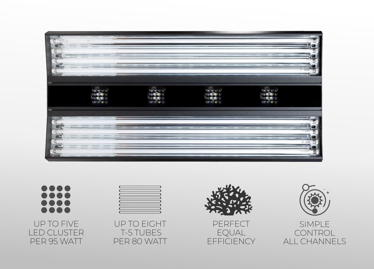 Eine außergewöhnliche Lichtausbeute wird bereits mit bis zu 5 leistungsstarken LED-Clustern mit einer maximalen Leistung von jeweils bis zu 95 Watt erreicht. Ergänzt werden diese LED-Cluster durch maximal 8 dimmbare HO T-5-Lampen, jeweils in 2er-Gruppen dimmbar von 0-100 %. Die genaue Lichtmischung bestimmen Sie selbst.