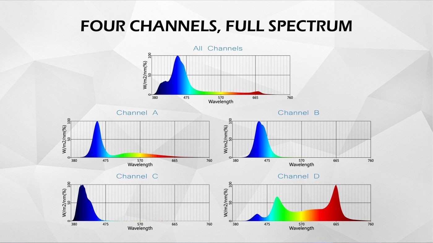 Das R420R-Beleuchtungssystem verwendet auch die 410/420-nm-Super-Actinic-LED-Chips, das Spektrum, das für den Erfolg von Riff- und Wasserpflanzenaquarien entscheidend ist, wie es von Chlorophyll A für die Photosynthese benötigt wird, mit einer Absorptionsspitze bei 412 nm.