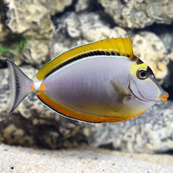 Der Naso Elegans , auch als Orangelippiger Nasendoktorfisch oder Blonder Nasendoktorfisch bekannt, ist ein anmutiger und auffälliger Fisch, der für seine friedliche Natur und Ästhetik beliebt ist. Dieser Fisch hat einen länglichen Körper mit einer graublauen Basis und einer leuchtend gelben Rückenflosse, einen auffälligen filamentierten Schwanz und leuchtend orangefarbene Lippen – ein echter Hingucker im Aquarium.