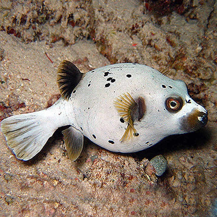 - Schwarze Flecken: Wie der Name schon sagt, ist dieser Kugelfisch mit zahlreichen schwarzen Flecken übersät.