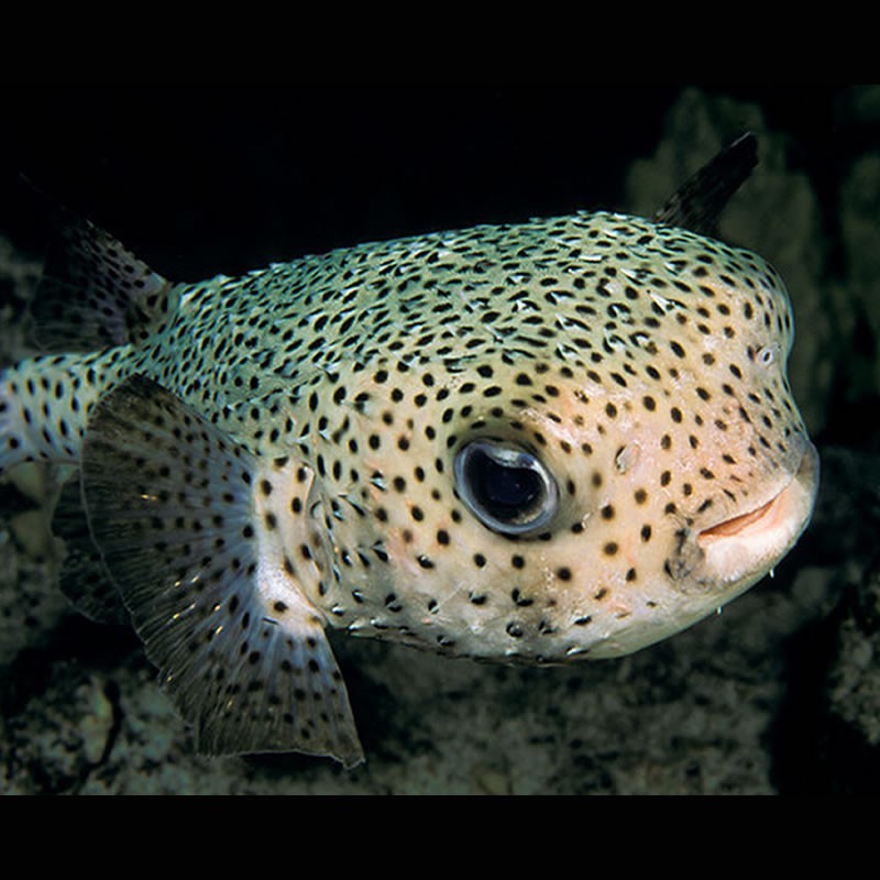 Aussehen: Diodon hystrix hat einen ovalen Körper, der mit langen Stacheln bedeckt ist. Wenn sich der Fisch aufbläst, richten sich die Stacheln auf, um sich gegen Raubtiere zu schützen. Die Farbe variiert von hellbraun bis grau, mit dunklen Flecken und Streifen am Körper.