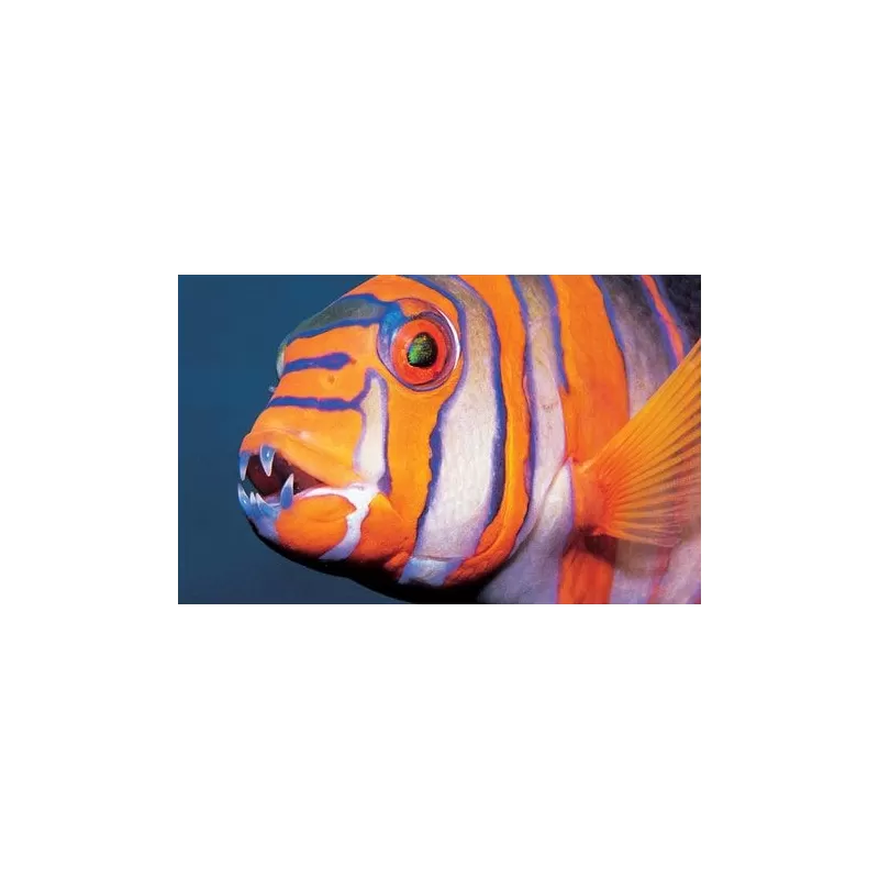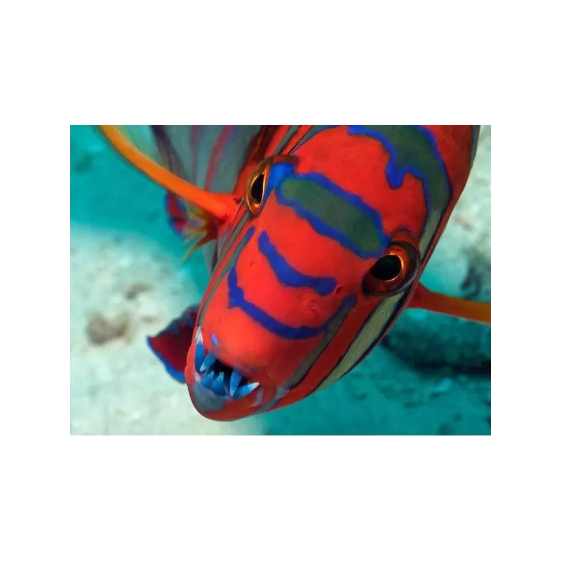 Der Choerodon fasciatus , besser bekannt als Harlekin-Lippfisch , ist ein beeindruckender Lippfisch, der sofort durch seine horizontalen blauen Streifen auf orangefarbenem bis rötlich-braunem Grund ins Auge fällt. Seine leuchtend blauen Zähne, die ihm den Spitznamen „Lippfisch“ einbrachten, verleihen diesem Fisch ein kraftvolles und einzigartiges Aussehen.