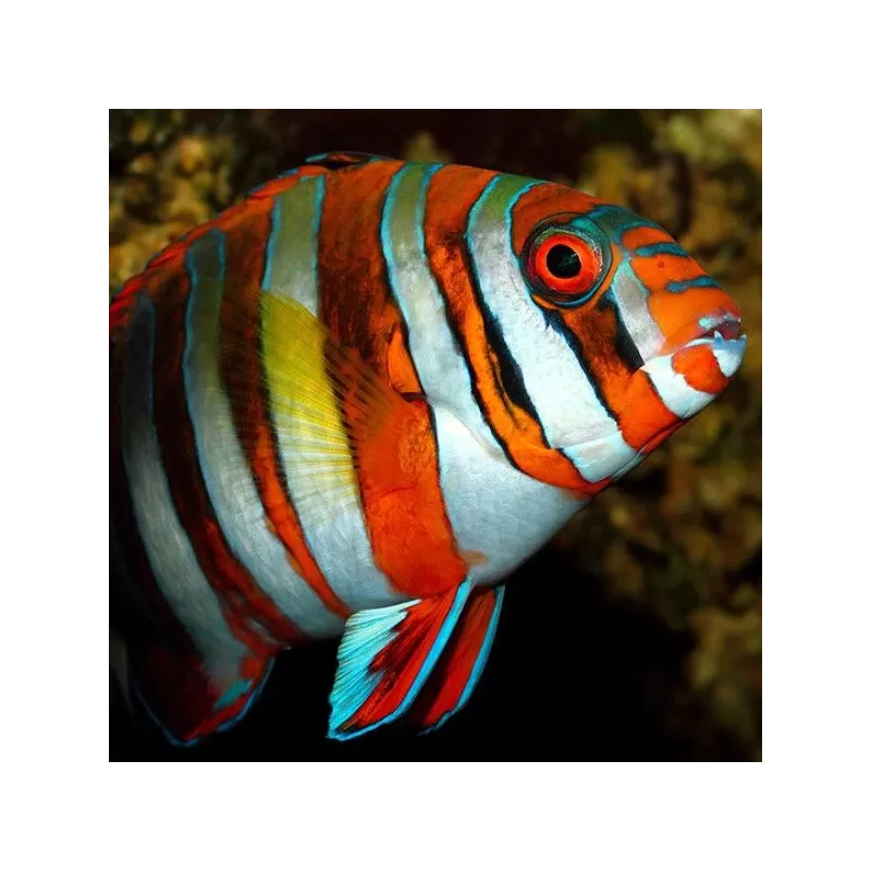 Der Choerodon fasciatus – Harlekin-Lippfisch – ist ein kräftiger und farbenprächtiger Meeresfisch, der im Aquarium eine imposante und beeindruckende Erscheinung abgibt. Sein einzigartiges Farbmuster, die blauen Zähne und sein aktives Verhalten machen diese Art zu einer spektakulären Wahl für erfahrene Aquarianer mit einem großen Meerwasseraquarium und robusten Mitbewohnern.