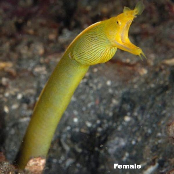 Jugendliche sind schwarz mit einer gelben Flosse, die Weibchen sind alle gelb mit einer schwarzen Flosse und die Männchen sind blau mit einer gelben Schnauze und einem gelben Unterkiefer.