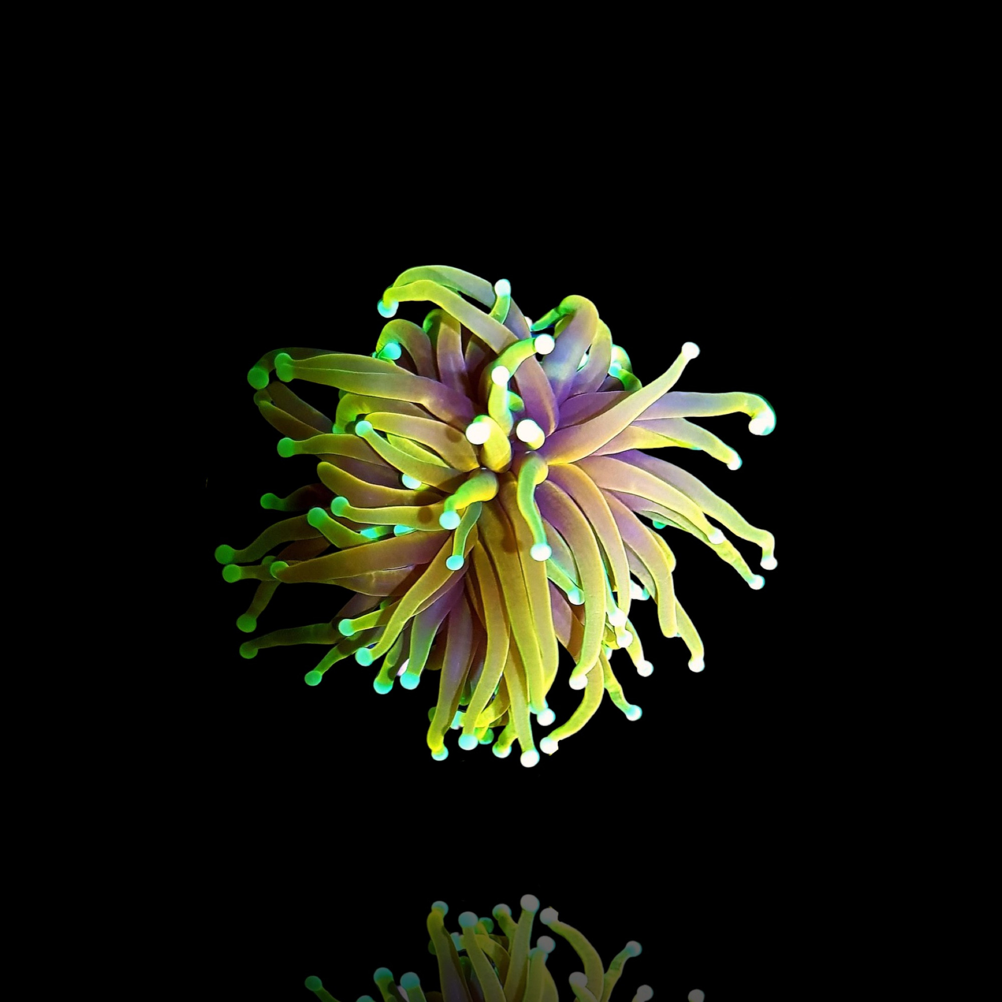 Euphyllia glabrescens Sun of God Torch ist eine legendäre und begehrte Art innerhalb der Torch-Familie. Diese einzigartige Korallenart besticht durch strahlend goldgelbe Tentakeln mit einem subtilen metallischen Schimmer, die unter blauem LED-Licht wie Sonnenstrahlen leuchten. Die Basis des Polypen reicht von dunkelbraun bis schwarz und erzeugt so einen markanten Farbkontrast.