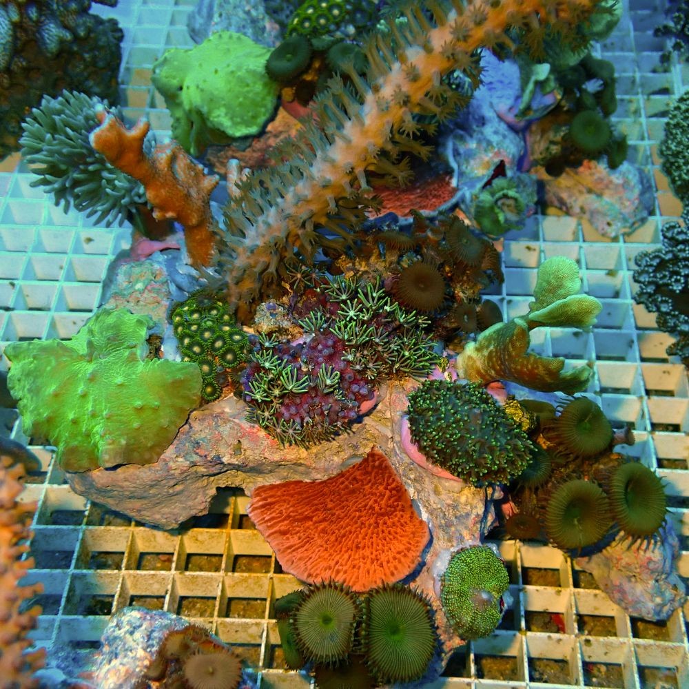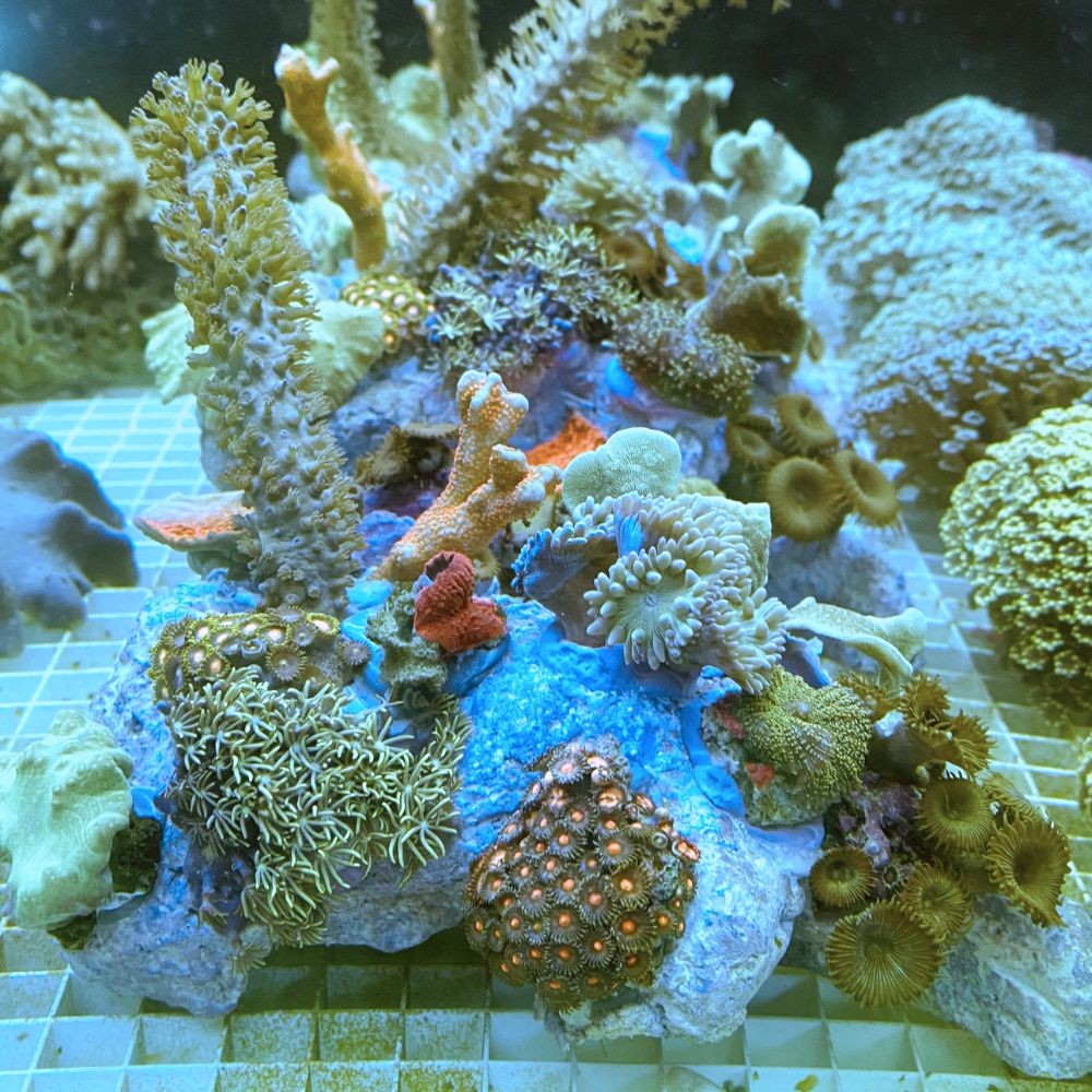 - Mischung aus verschiedenen Korallen, darunter LPS, SPS und Weichkorallen.