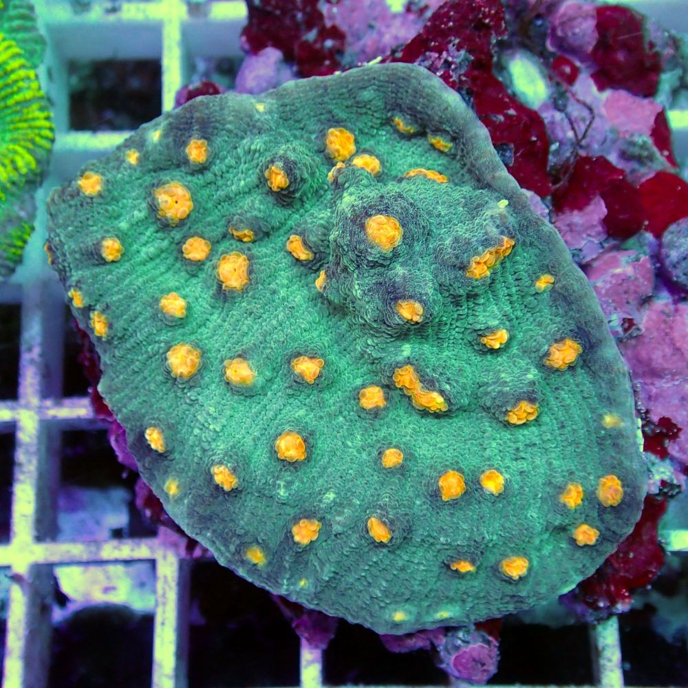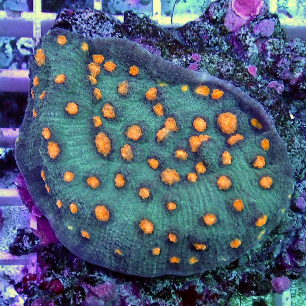 Die Mycedium Robokaki Coral ist eine robuste und schnell wachsende Steinkoralle mit großen Polypen (LPS) und einem dünnen, plattenförmigen Wuchs. Die Mycedium Robokaki-Koralle benötigt eine geringe bis mäßige Beleuchtung, die mit T-5-Lampen, Hochleistungs-LEDs oder den intensiveren Metallhalogeniden in Kombination mit geringer bis mäßiger Wasserbewegung im Aquarium erreicht werden kann. Bitte beachten Sie, dass die Mycedium Robokaki-Koralle Angriffstentakel produzieren kann, die für friedlichere Korallen und Wirbellose schädlich sein können. Stellen Sie sicher, dass zwischen der Mycedium Robokaki-Koralle und anderen Korallen genügend Platz ist, da sie ein halbaggressives Temperament hat.