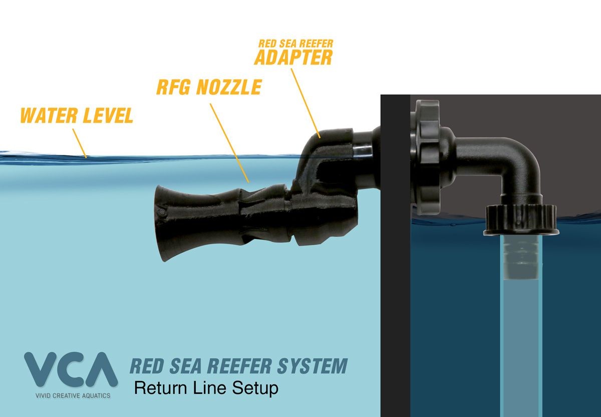 Damit der Random Flow Generator funktioniert, muss er vollständig untergetaucht sein. Das Red Sea Reefer-Setup platziert die Rücklaufdüse direkt an der Wasserlinie. Der Red Sea Reefer Adapter löst dieses Problem, indem er die Düse gerade weit genug für einen ordnungsgemäßen Betrieb unter die Wasserlinie senkt.