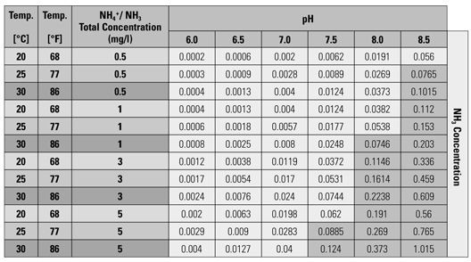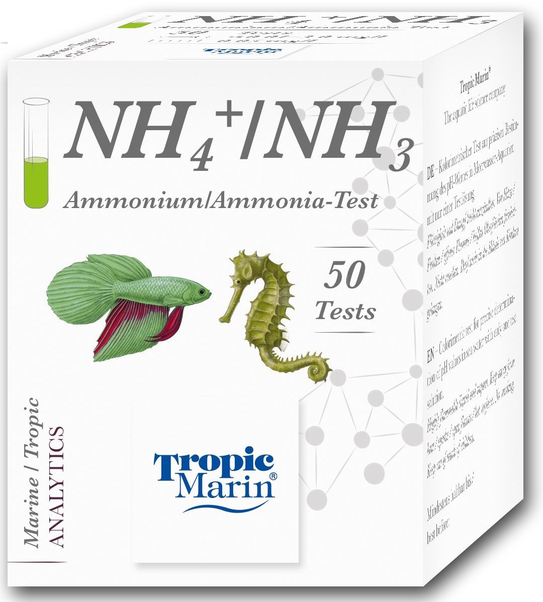 Mit dem Tropic Marin® Ammonium/Ammonia-Test kann die Gesamt-Ammonium/Ammoniak-Konzentration anhand einer fein abgestimmten Farbkarte mit einem Konzentrationsbereich von 0,02 - 3 mg/l bestimmt werden. Entscheidend ist, dass die sich aus der Ammoniak/Ammonium-Konzentration ergebende Gesamt-Ammoniak-Konzentration von der Temperatur und dem pH-Wert abhängt.
