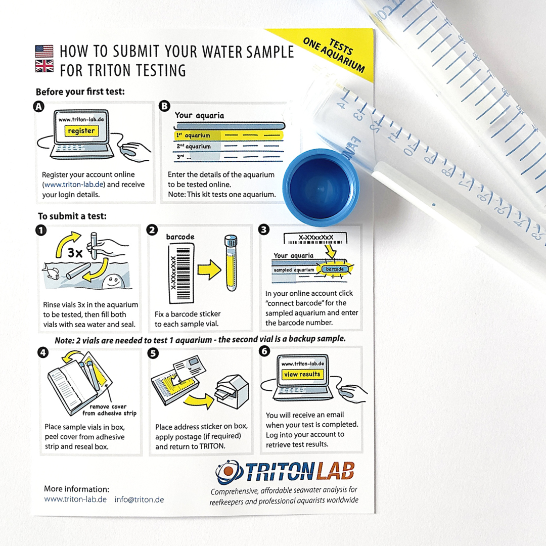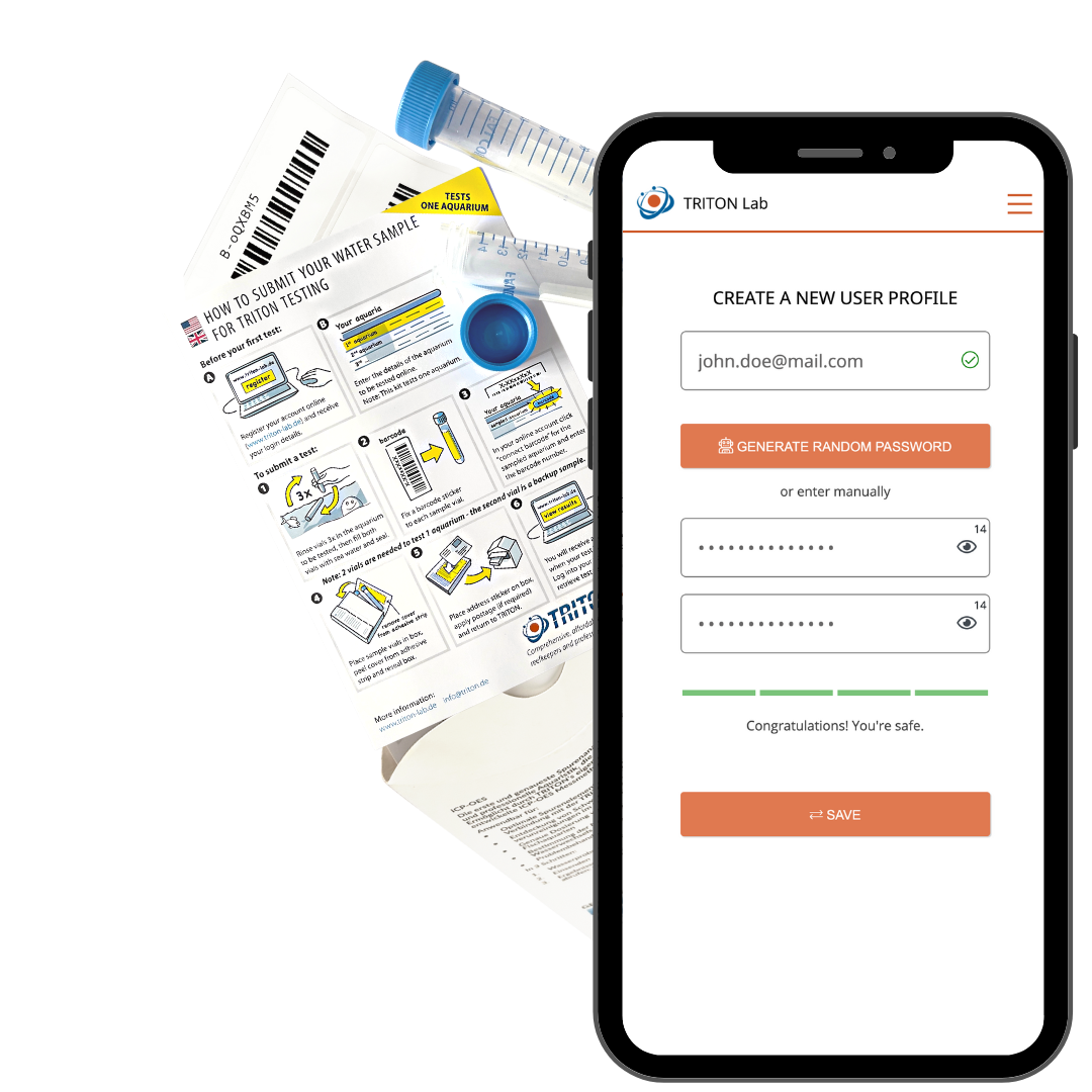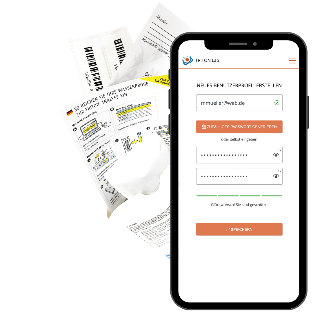 Registrieren Sie sich oben auf dieser Website, um eine Benutzer-ID zu erhalten. Anschließend haben Sie die Möglichkeit, Ihr Aquarium oder mehrere Aquarien anzumelden. Ihr Aquarium bzw. Ihre Aquarien erhalten dann eine eigene Aquarium-ID, die Sie dann auf dem ID-No/Login-No-Aufkleber eintragen und auf die Probenflasche kleben.