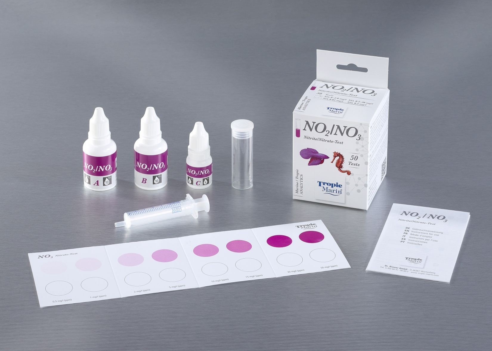 Mit dem Tropic Marin® Nitrit / Nitrat Test können die Nitrit- und Nitratkonzentrationen anhand einer fein abgestimmten Farbkarte mit einem Konzentrationsbereich für Nitrit zwischen 0 - 2 ppm und für Nitrat zwischen 0 - 50 ppm bestimmt werden.