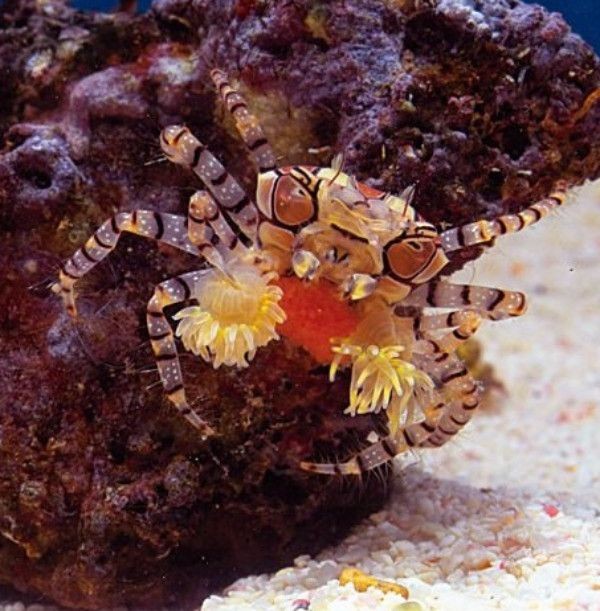 Die Pom Pom-Krabbe ist eine sehr kleine Krabbe, nicht größer als 0,5 cm. Es hat eine kleine Anemone in jedem Bein, die ihm hilft, sich gegen Raubtiere und andere Krabben zu verteidigen. Diese kleinen Anemonen sind für andere Tiere sehr giftig, daher lassen sie die Krabbe oft in Ruhe.