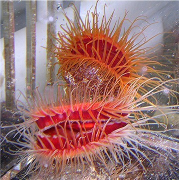 - Leuchtend gefärbte Tentakel: Die Feilenmuschel hat leuchtend rote bis orangefarbene Tentakel, die einen auffälligen Kontrast zu ihrem weißen oder bräunlichen Panzer bilden.