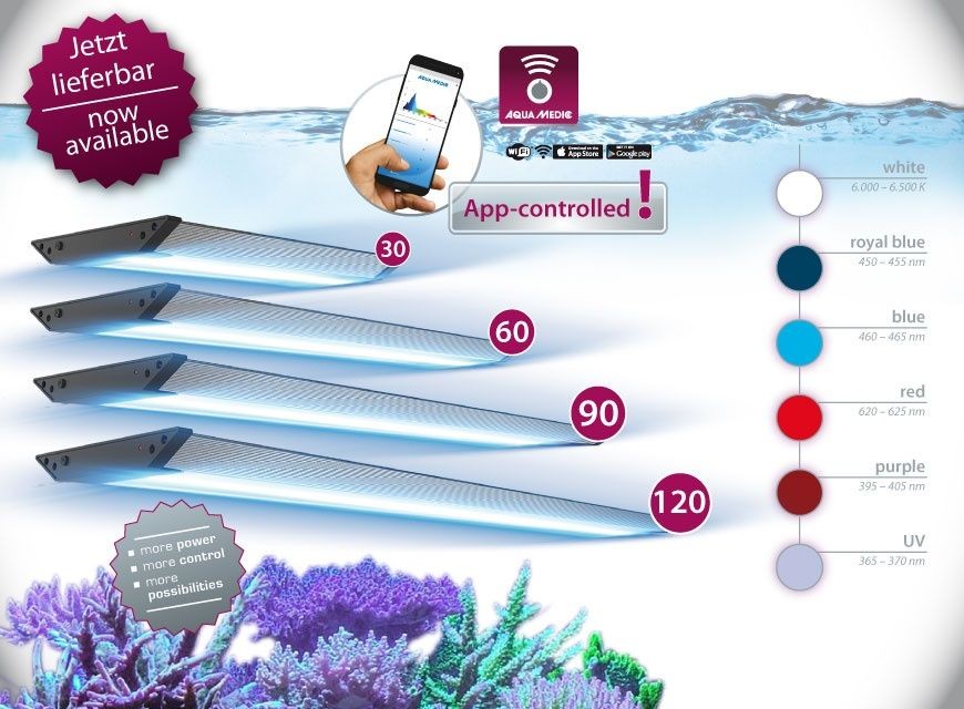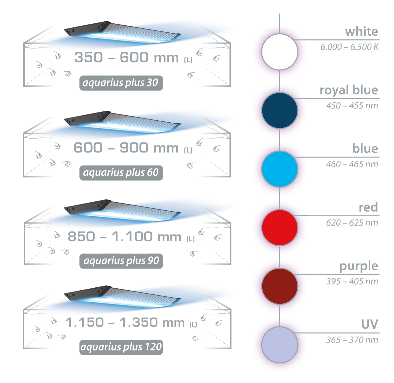 De aquarius plus met zijn vlakke aluminium behuizing zorgt voor een bijzonder gelijkmatige verlichting van uw aquarium. De combinatie van de zes individuele lichtkleuren is speciaal afgestemd op de behoeften van zoutwateraquaria.