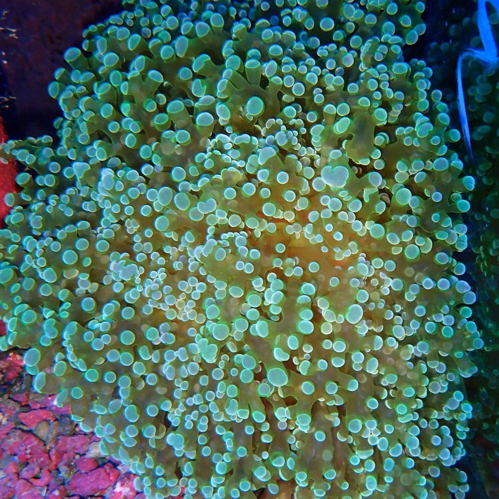 Euphyllia divisa Green , plus connu sous le nom de corail vert à œufs de grenouille , est une espèce de corail LPS très appréciée qui se distingue par ses tentacules d'un vert éclatant aux extrémités arrondies. Ses polypes ressemblent à des œufs de grenouille, d'où son surnom. Avec ses mouvements gracieux au gré des courants, ce corail apporte une touche naturelle et dynamique à tout aquarium récifal.