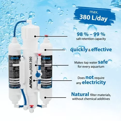 De ARKA myAQUA® 380 Reverse Osmosis System is een krachtig en compact waterzuiveringssysteem dat tot 380 liter per dag produceert. Dit hoogwaardige RO-systeem verwijdert effectief chloor, zware metalen, nitraten, fosfaten en andere schadelijke stoffen uit leidingwater, waardoor je zeeaquarium wordt voorzien van ultrazuiver water.