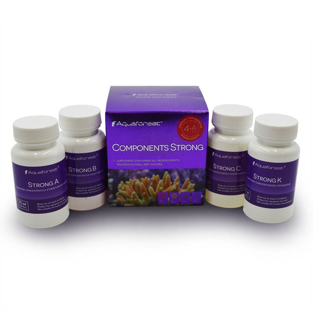 Aquaforest Components Strong is een set van vier hooggeconcentreerde supplementen, ontworpen om de gezondheid, groei en kleur van koralen in rifaquaria te ondersteunen. Deze producten bevatten belangrijke sporenelementen die nodig zijn voor optimale omstandigheden in uw aquarium.