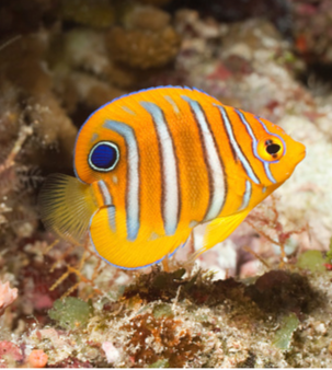 De Pauwoog Keizervis of de Regal Angelfish wordt ongeveer 25 cm lang en zijn geschikt voor de wat grotere aquaria.