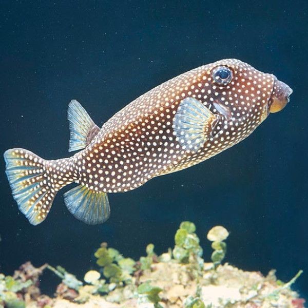 Een Whitespotted Boxfish wordt 25 cm en is een trage zwemmer, dus zeker niet geschikt voor een aquarium met sterke stroming.