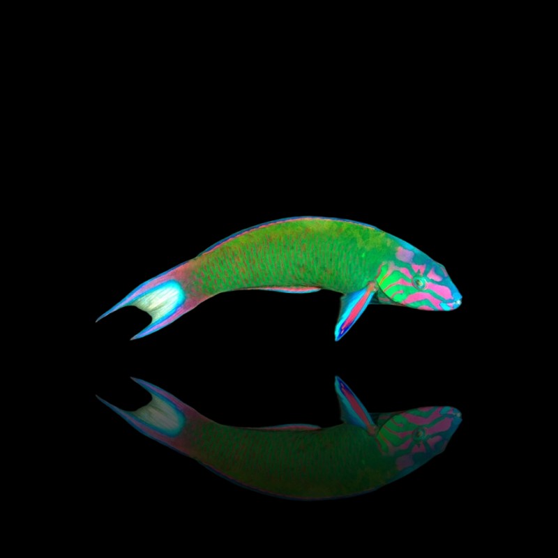 - Labre très coloré, au corps bleu-vert vif et aux accents contrastés.