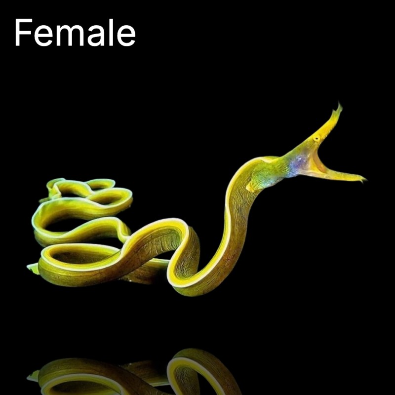 La femelle de Rhinomuraena quaesita, plus connue sous le nom de murène ruban bleue , est l'une des murènes les plus singulières des aquariums marins. Les femelles adultes sont entièrement jaunes, ce qui contraste fortement avec la forme bleue du mâle et le stade juvénile noir.